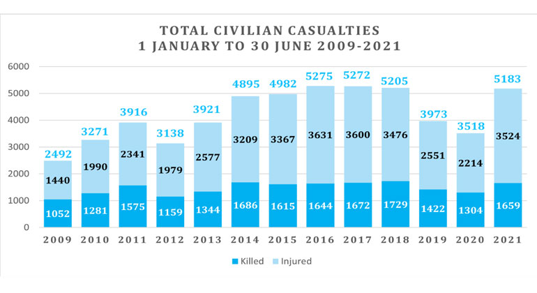 The UN Assistance Mission in Afghanistan (UNAMA) reported in its Afghanistan Protection of Civilians in Armed Conflict midyear update, that there were 1,659 civilians killed and 3,254 wounded; a 47 per cent increase compared with the same period last year.
