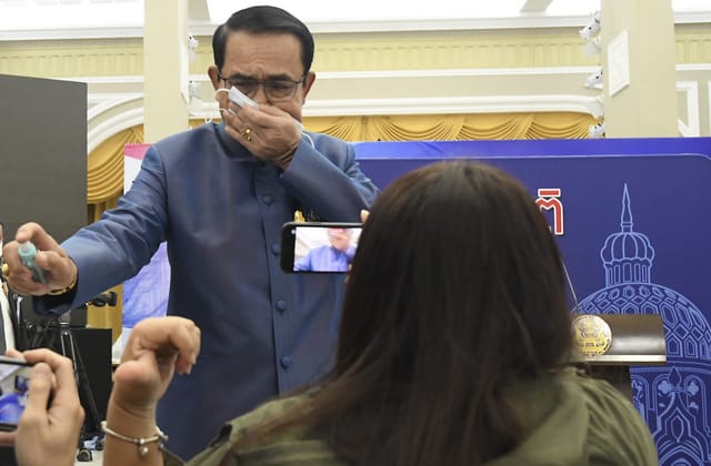 After fielding a slew of questions from journalists at his weekly news conference in Bangkok, the famously mercurial Prayuth Chan-ocha sprayed back — with disinfectant.